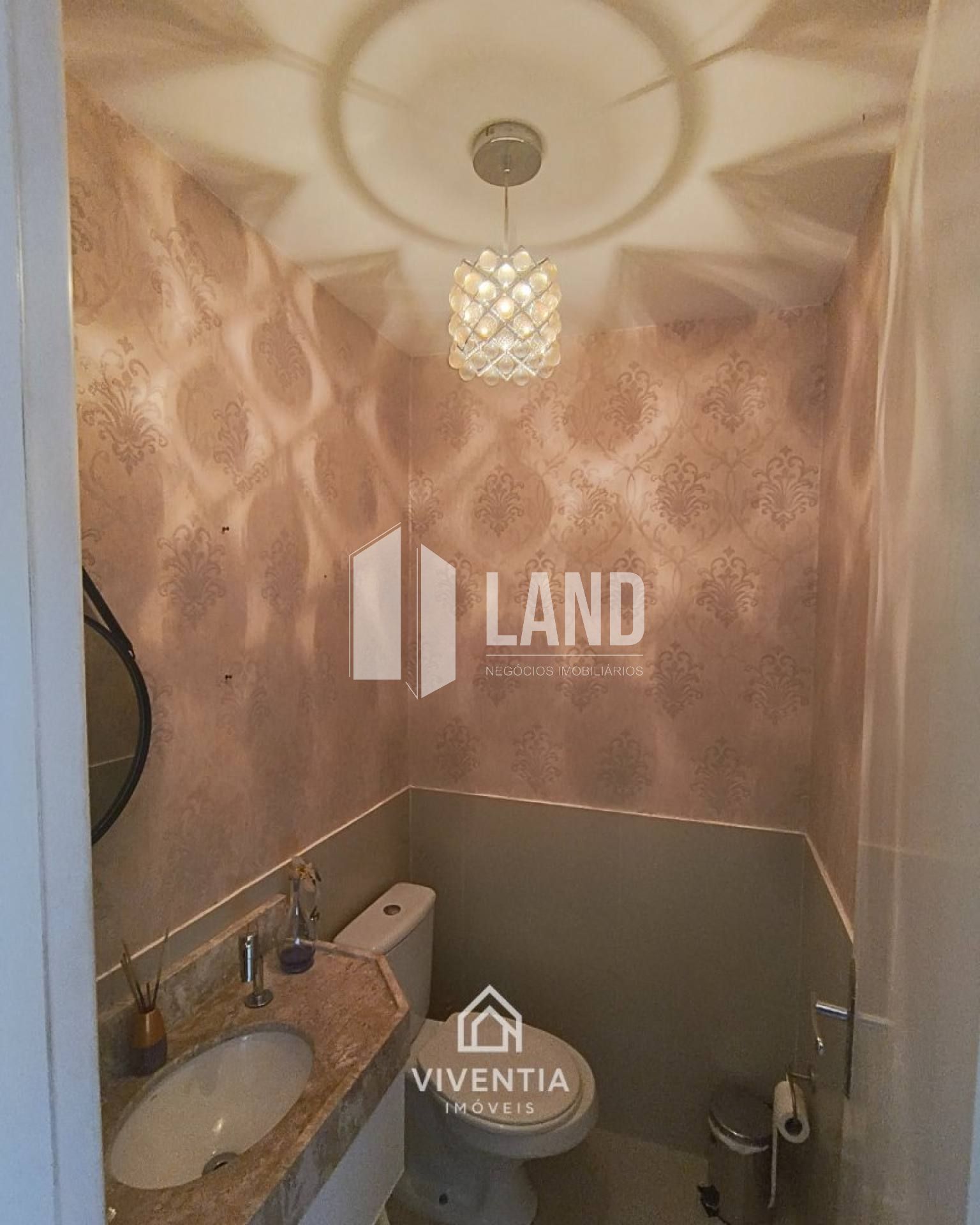 - Sala com pé-direito duplo, lavabo e lustre