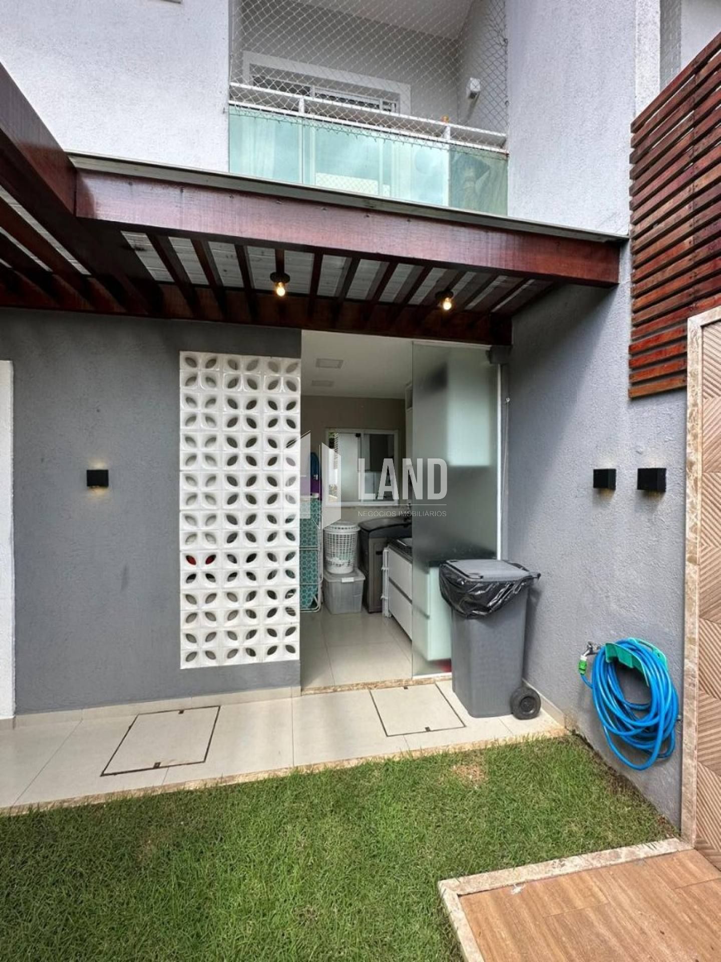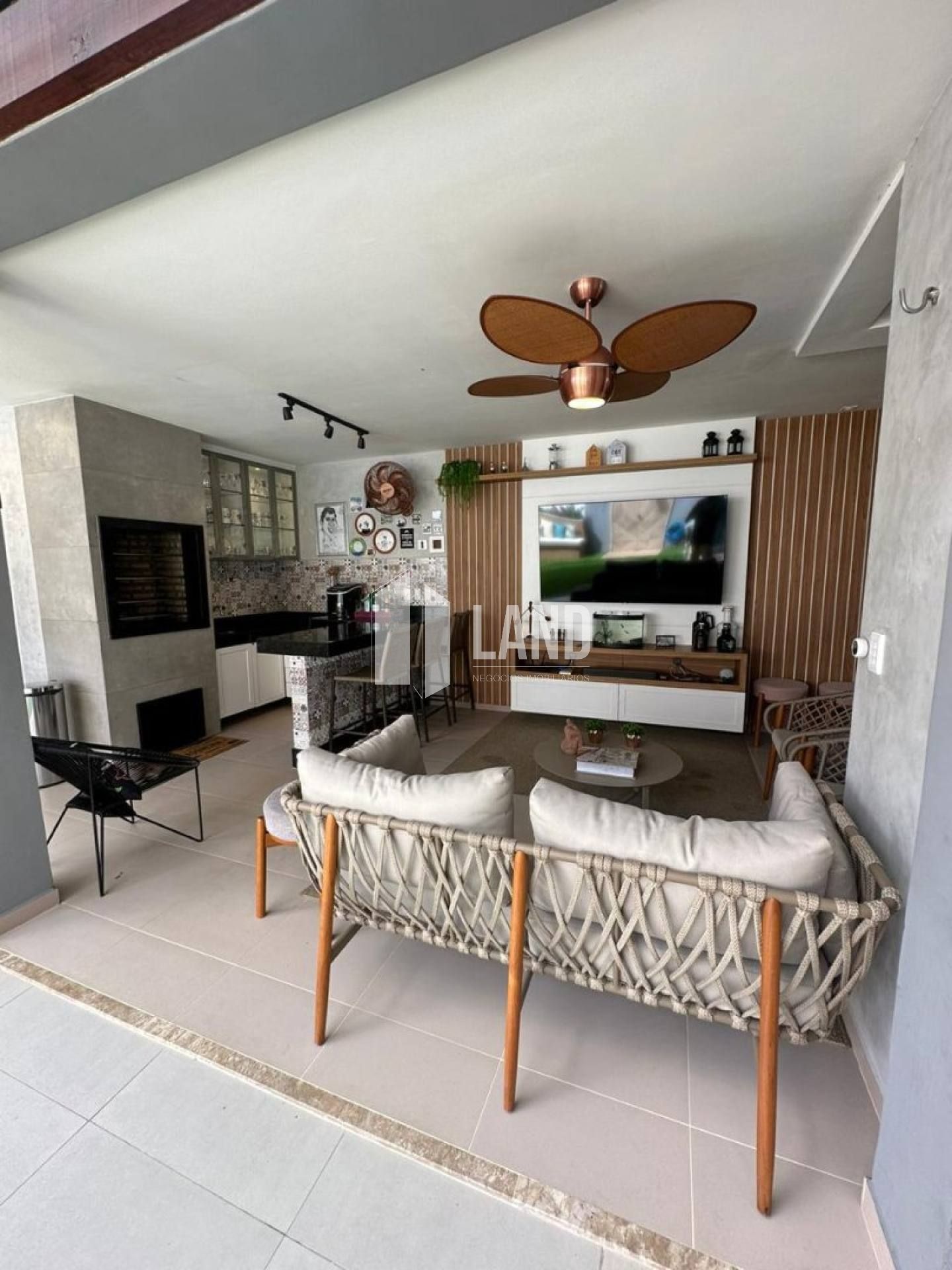 Área externa com deck privativo, churrasqueira, espaço gourmet e chuveirão, ideal para momentos de lazer.